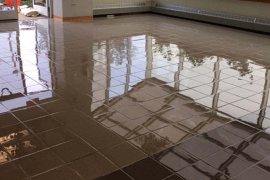 Client had consistently coated terrazzo floor with 4-8 coats of wax. On a quarterly basis, a burnish and buffing was required to remove scratches and yellowing from wax applications. Annually, wax was stripped and re-applied. Client sought a long-term solution: easy to clean and maintain, and provide a high-gloss shine for appearance.